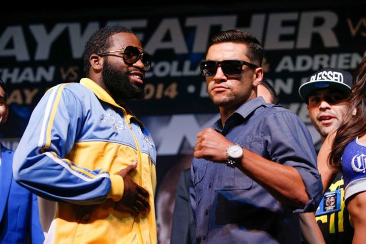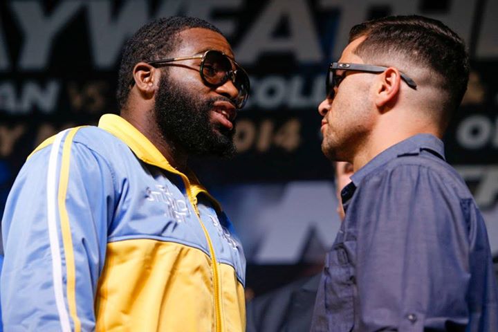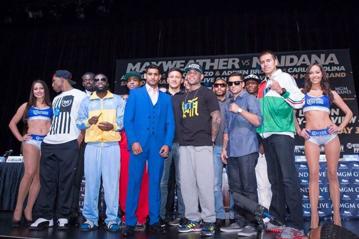 Вчера состоялась пресс-конференция участников «разогревочных» боев PPV-шоу 3 мая в Лас-Вегасе (штат Невада, США) Флойд Мейвезер-младший — Маркос Майдана. В этот день экс-чемпион мира в трех весовых категориях 24-летний американец Эдриэн Бронер выйдет на ринг против 28-летнего американского боксера Карлоса Молины. Британец Амир Хан встретится с Луисом Коллацо. Также в рамках вечера состоится бой 26-летнего американского боксера второго среднего веса Джей’Леона Лава и бывшего претендента на титул чемпиона мира во втором среднем весе 29-летнего мексиканца Марко Антонио Перибана. (Фото: Esther Lin/SHOWTIME)