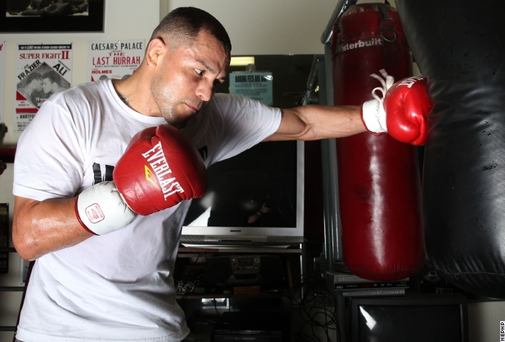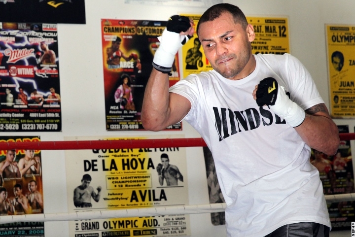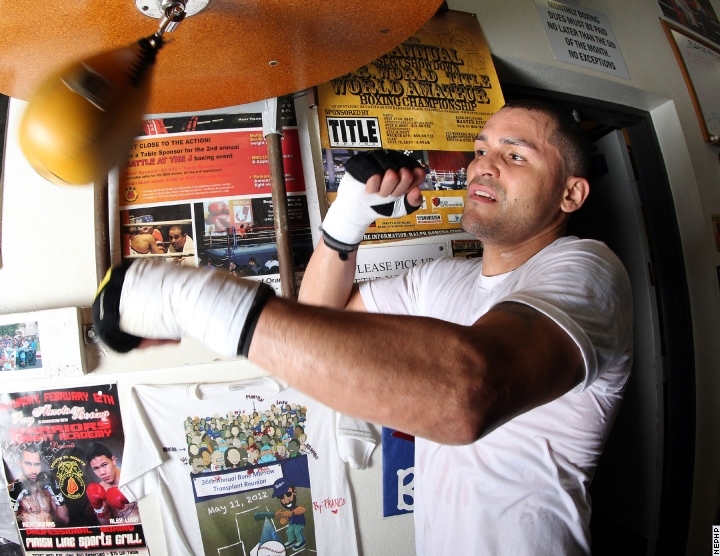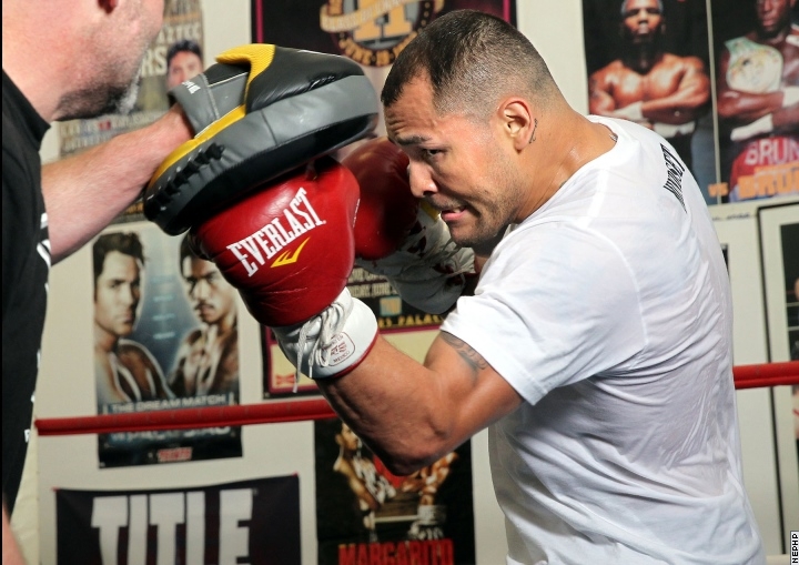 Тренировка экс-чемпиона мира в первом полусреднем весе 33-летнего американца Майка Альварадо, которому 17 мая предстоит поединок с экс-чемпионом мира в четырех весовых категориях 40-летним мексиканцем Хуаном Мануэлем Маркесом. (Фото: Chris Farina/Top Rank/BoxingScene.com)
