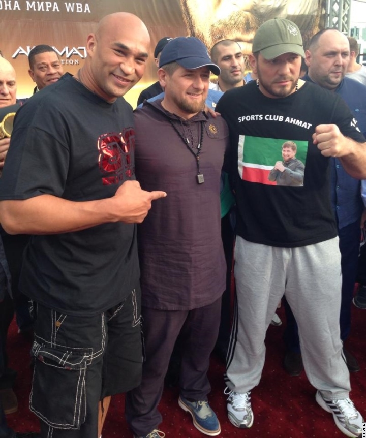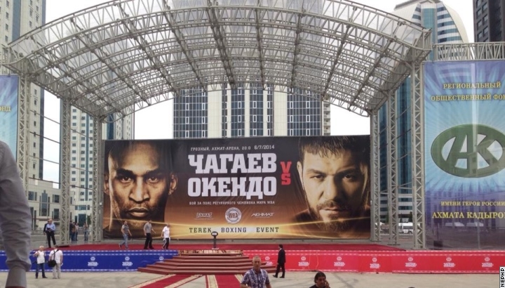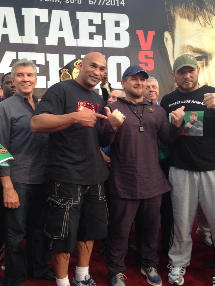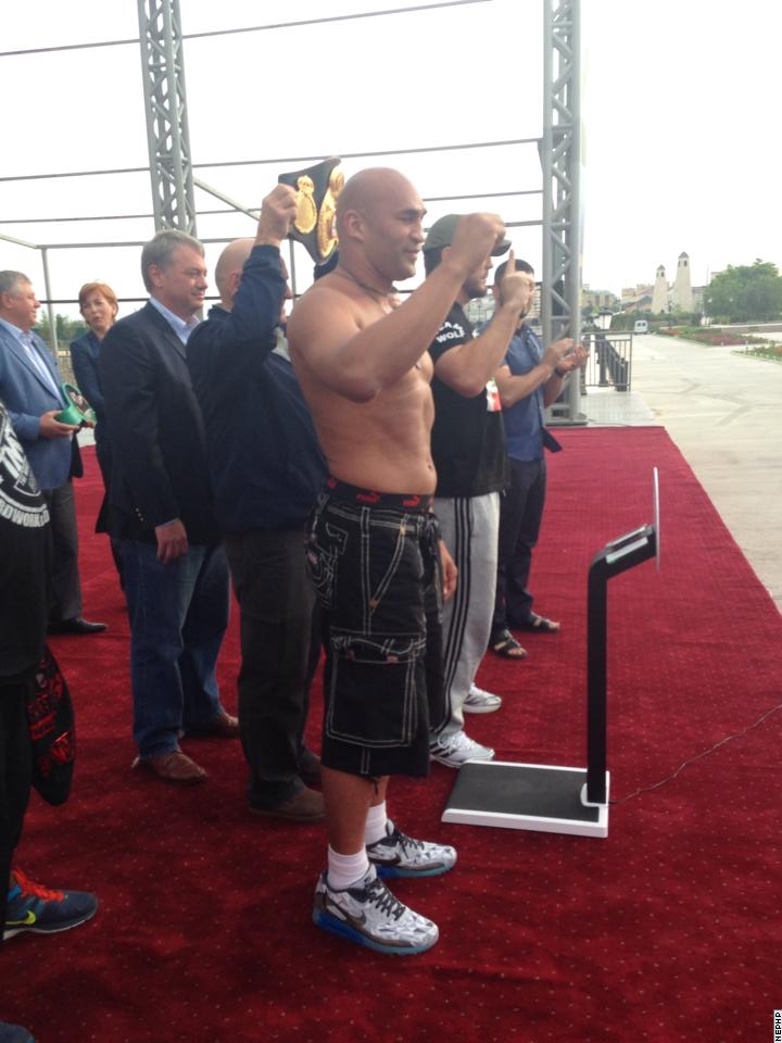 Сегодня в Грозном (Чеченская республика, Россия) состоялась процедура взвешивания перед завтрашним поединком, в котором экс-чемпион мира в супертяжелом весе 35-летний Руслан Чагаев и 41-летний американец Фрес Окендо разыграют вакантный титул чемпиона мира по версии WBA Regular в супертяжелом весе. Чагаев показал на весах 244 фунта (110,7 кг), Окендо — 222 фунта (100,7 кг). (Фото: BoxingScene.com)