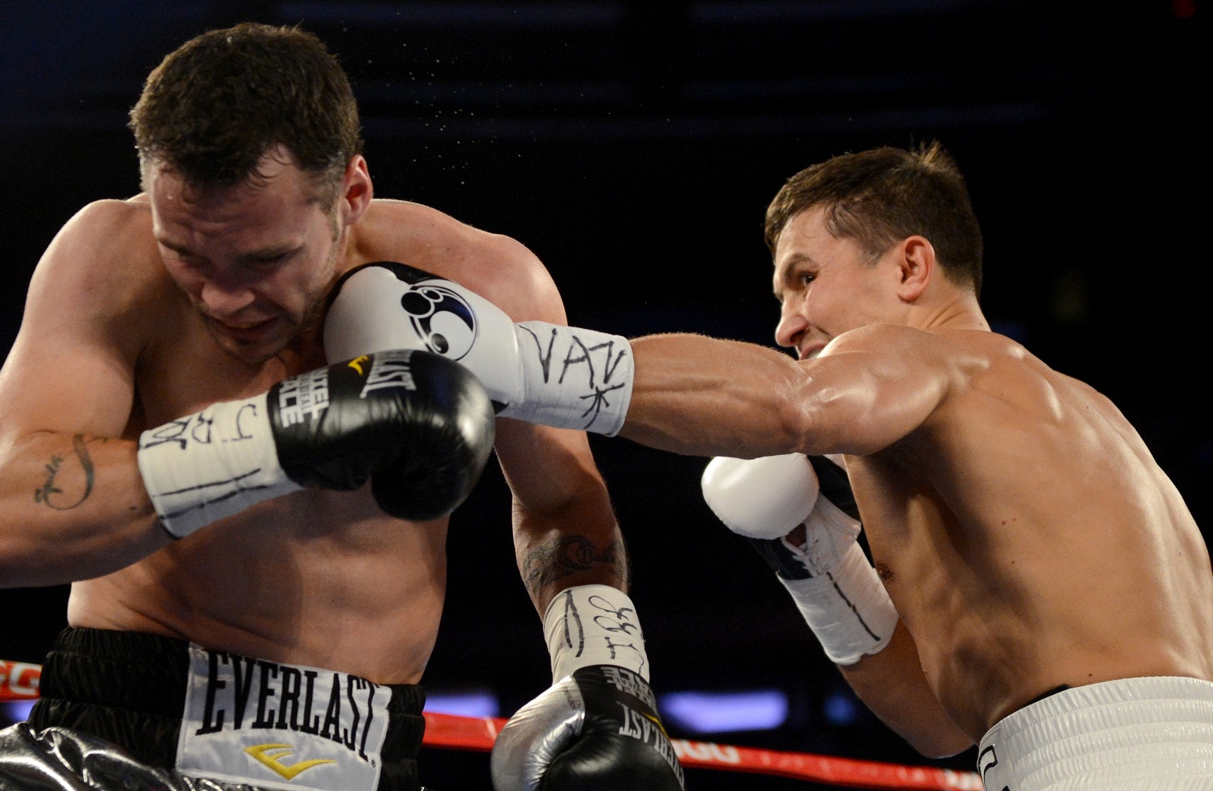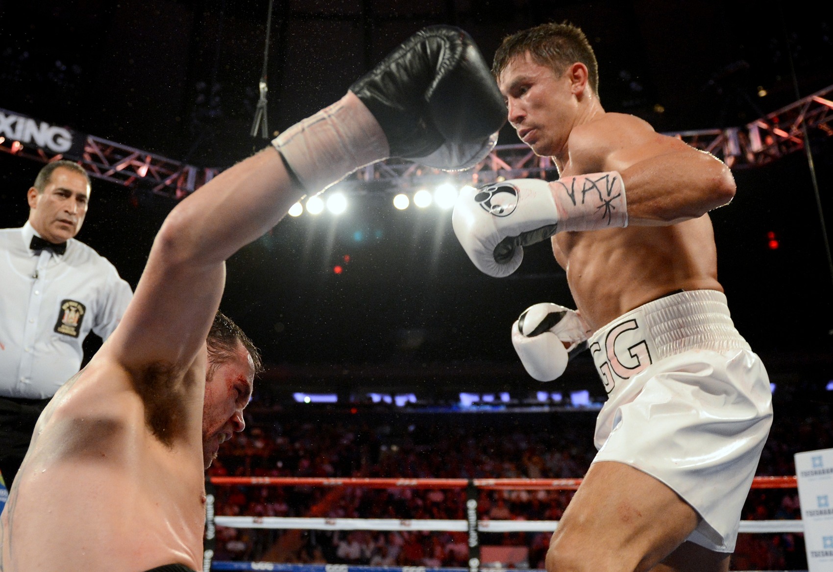Вчера в Нью-Йорке (США) на арене Madison Square Garden состоялся вечер профессионального бокса, в главном поединке которого чемпион мира по версии WBA (Super) в среднем весе 32-летний казахстанец Геннадий Головкин одержал победу техническим нокаутом в третьем раунде над экс-чемпионом мира в этой же весовой категории 33-летним австралийцем Дэниэлом Гилом. (Фото: Naoki Fukuda / RingTV )