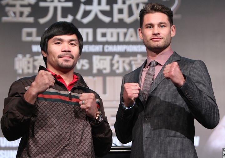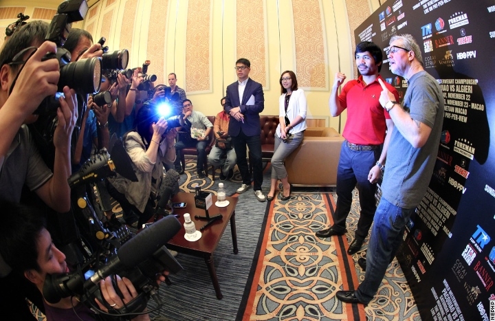 В Макао (Китай) состоялась первая пресс-конференция, посвященная намеченному на 22 ноября поединку одиного из сильнейших боксеров мира 35-летнего филиппинца Мэнни Пакьяо против не имеющего поражений 30-летнего американца Криса Алгиери. (Фото: BoxingScene.com)