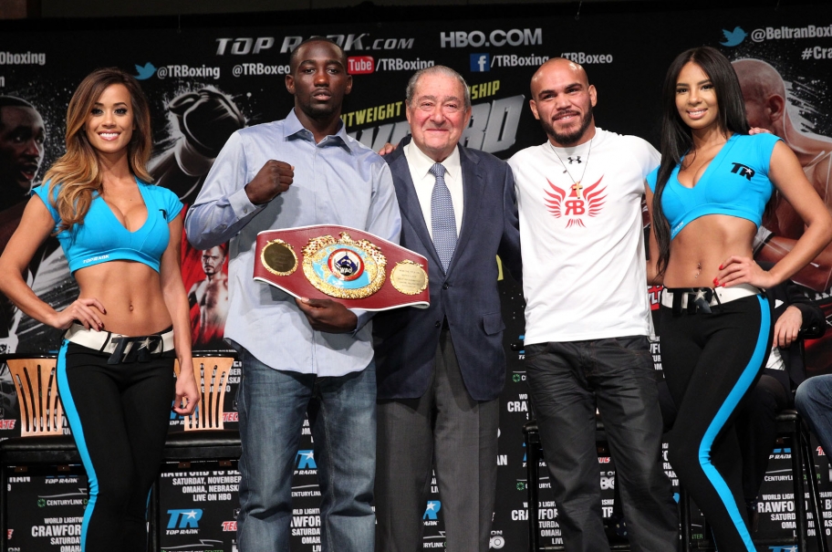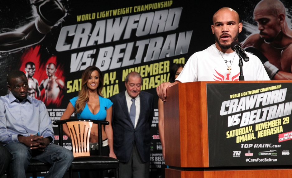 Чемпион мира в легком весе по версии WBO 26-летний американец Теренс Кроуфорд, 28 июня в США нокаутировавший кубинца Юриоркиса Гамбоа, свой следующий бой проведет против 32-летнего мексиканца Рэя Белтрана. Этот поединок состоится 29 ноября в родном городе Кроуфорда Омахе. Вчера состоялась пресс-конференция, посвященная этому событию. (Фото: Chris Farina/Top Rank)