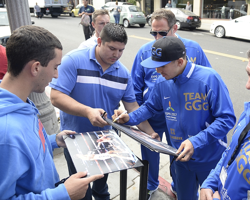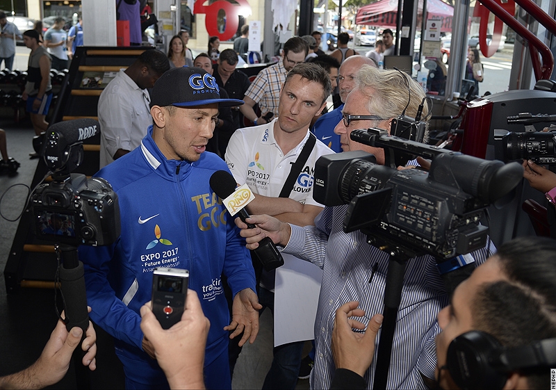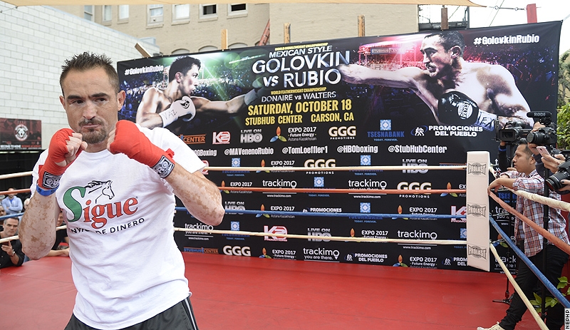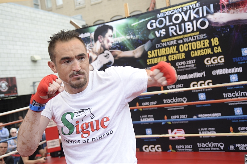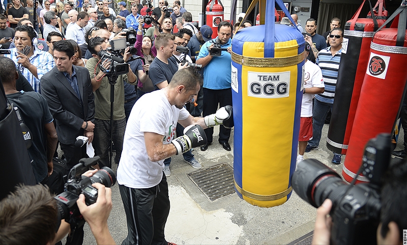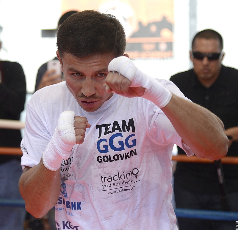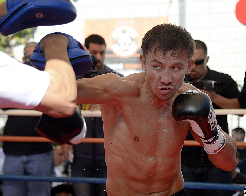 Вчера в США состоялась открытая тренировка перед намеченным на эту субботу боем между чемпионом мира по версии WBA (Super) в среднем весе 32-летним казахстанцем Геннадием Головкиным и временным чемпионом WBC в этом же весе 34-летним мексиканцем Марко Антонио Рубио. (Фото: Gene Blevins/Hoganphotos/BoxingScene.com)