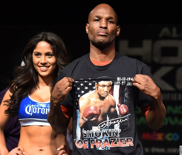 Фото процедуры взвешивания перед поединком 8 ноября между чемпионом мира по версиям IBF и WBA (Super) в полутяжелом весе 49-летним американцем Бернардом Хопкинсом (173,5 фунта; 78,7 кг) и чемпионом мира по версии WBО в этом же весе 31-летним россиянином Сергеем Ковалевым (174,5 фунта; 79,15 кг). (Фото: BoxingScene.com)