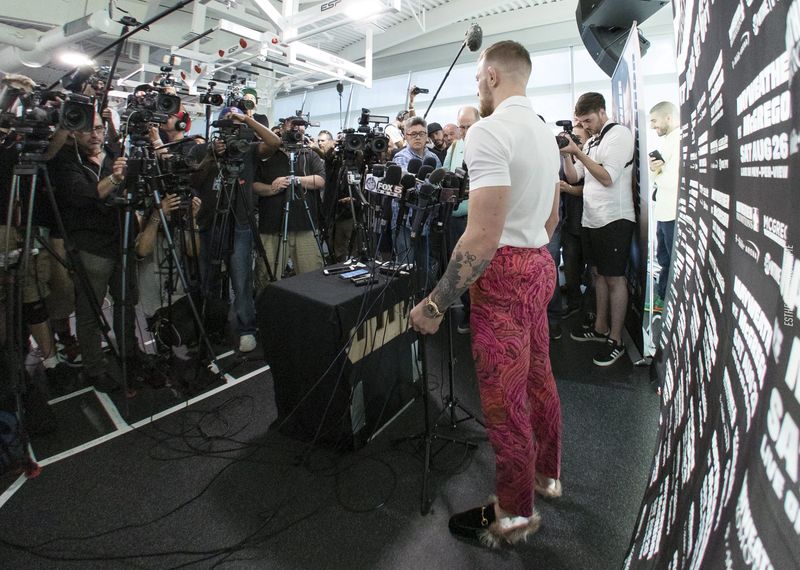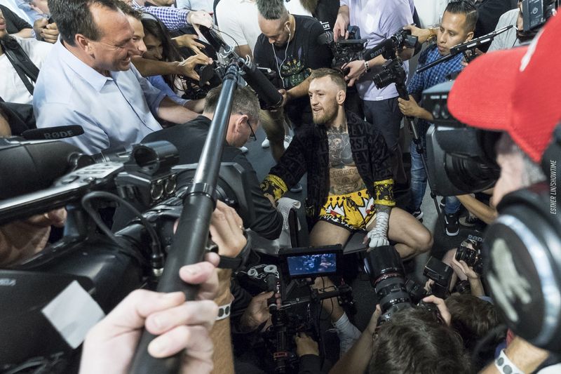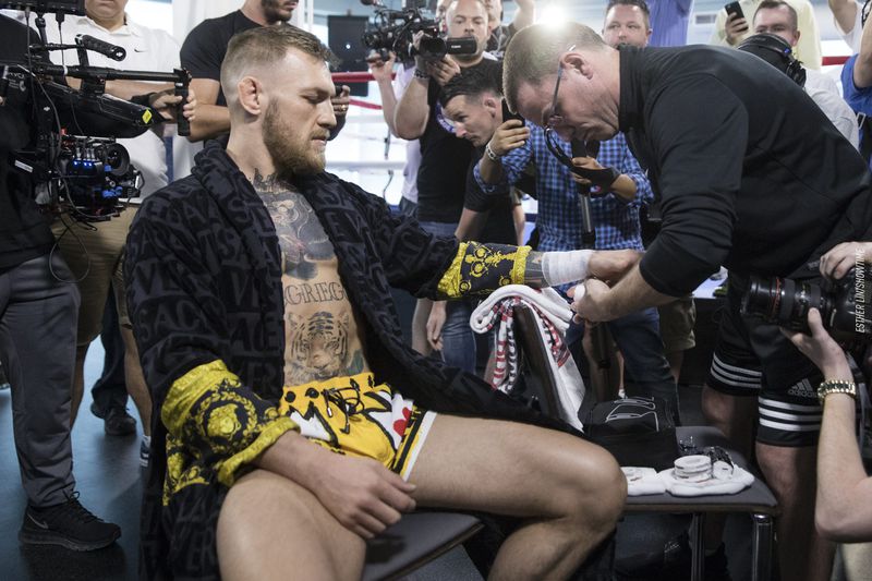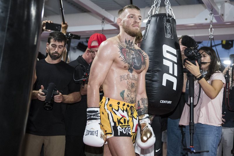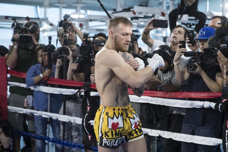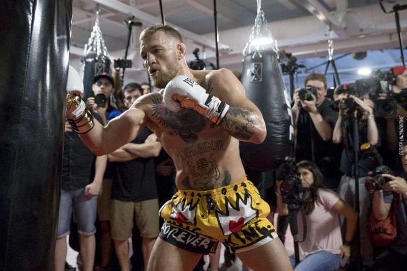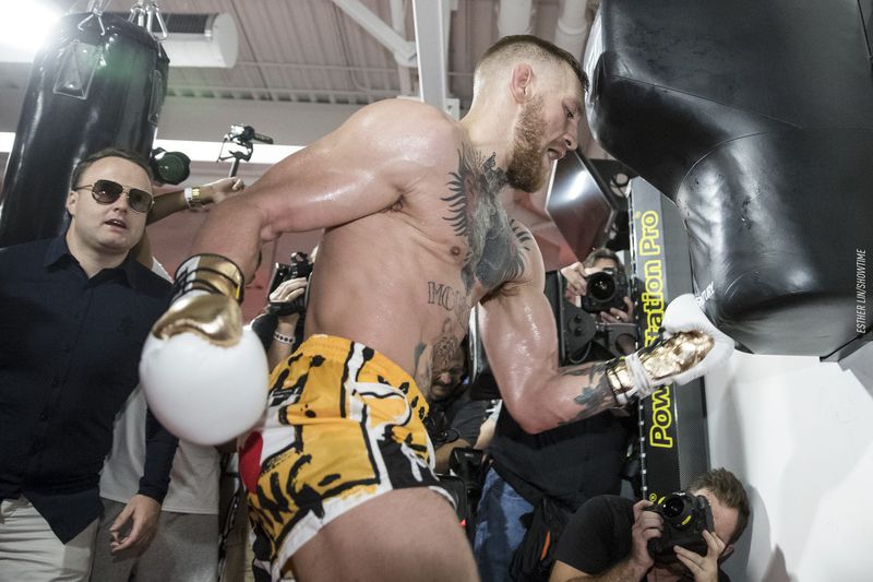 Представляем фото с открытой тренировки чемпиона UFC в легком весе Конора Макгрегора. 26 августа Конору предстоит провести бой с экс-чемпионом мира по боксу в нескольких весовых категориях Флойдом Мейвезером-младшим. (Photo: Esther Lin, Showtime)