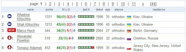 C cегодняшнего дня Марко Хук числится в мировом рейтинге супертяжеловесов boxrec.com на 3 месте, опережая Александра Поветкина на 1 позицию: