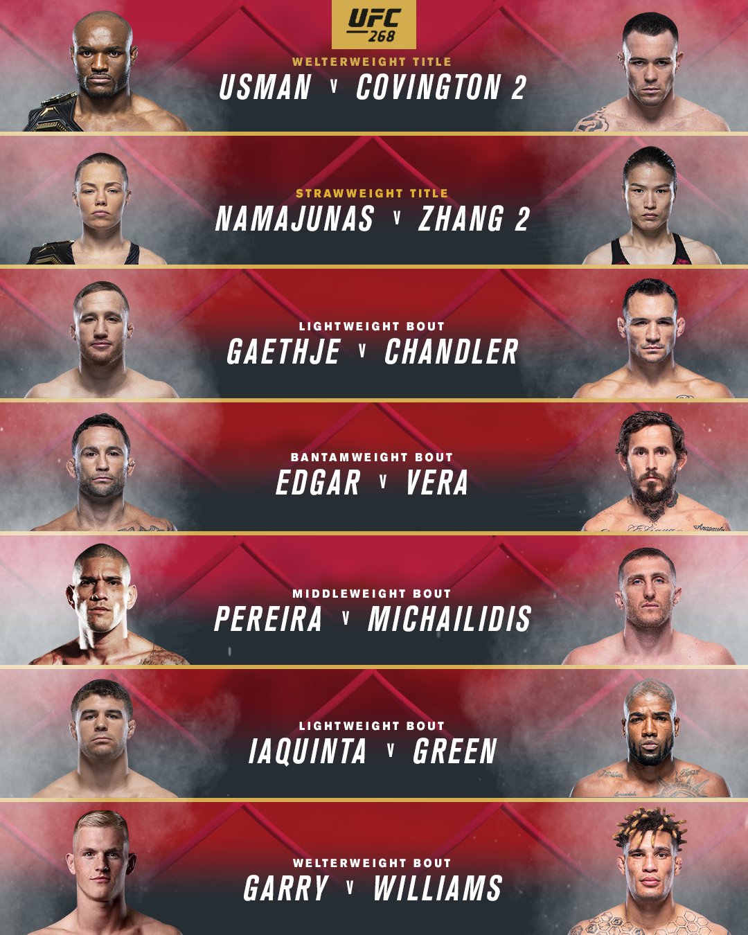 7 ноября в Лас-Вегасе состоится шоу UFC 268. В главном бою шоу чемпион UFC в полусреднем весе Камару Усман встретится с Колби Ковингтоном. Вторым по важности боем шоу станет встреча чемпионки в минимальном весе Роуз Намаюнас и Вейли Жанг.