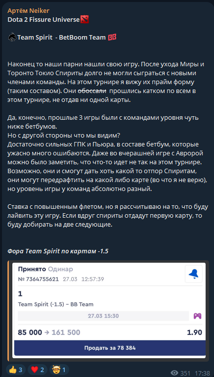Артем прогнозирует две кибердисциплины — Dota 2 и CS2. К прогнозам выкладывается авторская аналитика, которая подтверждает, что капер отслеживает изменения в составе команд, проводит анализ и делает выводы.