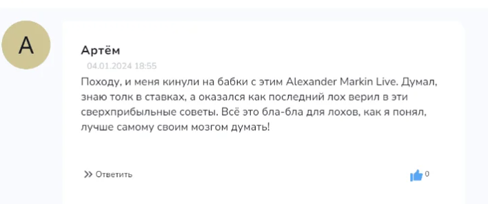 Александр Маркин | Блог – это старое название Телеграм-канала Гол и точка. Еще одно известное название проекта – Alexander Markin | Live. Аналитик активно рекламирует нелегальную букмекерскую контору. Его доход строится на реферальной системе: каппер получает процент с проигранных ставок пользователей. Помимо этого, он продвигает сомнительные ресурсы и проекты. Мы провели детальную проверку его деятельности, проанализировали методы работы, качество прогнозов и отзывы пользователей. Итоговый вывод: проект вызывает обоснованные сомнения.