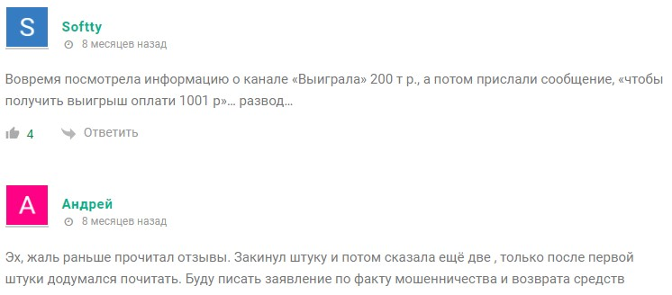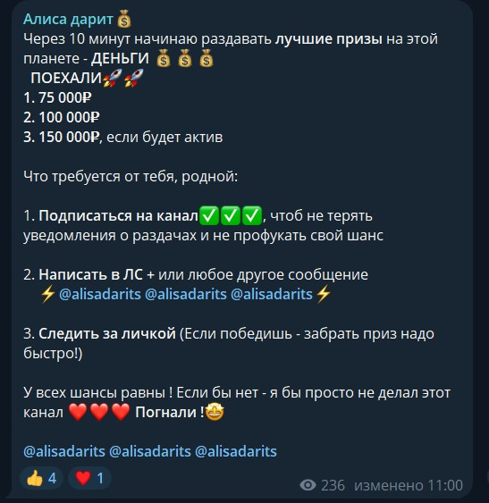 Параллельно в ленте проводятся фейковые розыгрыши денежных сумм: 75 000, 100 000 и 150 000 рублей. Любой, кто пишет администратору, автоматически становится «победителем». Далее начинается серия требований дополнительных платежей — от «подтверждения личности» до «уплаты налога».