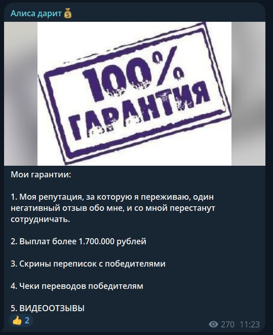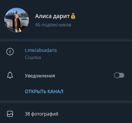 Алиса – Дарит — мошеннический Telegram-канал, не имеющий отношения ни к инвестициям, ни к честным розыгрышам. Проект построен на вранье, поддельных скринах и фальшивых переписках. Участие в конкурсах, «раскрутках» и переписка с администратором неизбежно приведут к потерям. Мы однозначно не рекомендуем переводить какие-либо суммы или сообщать персональные данные.