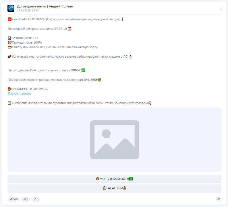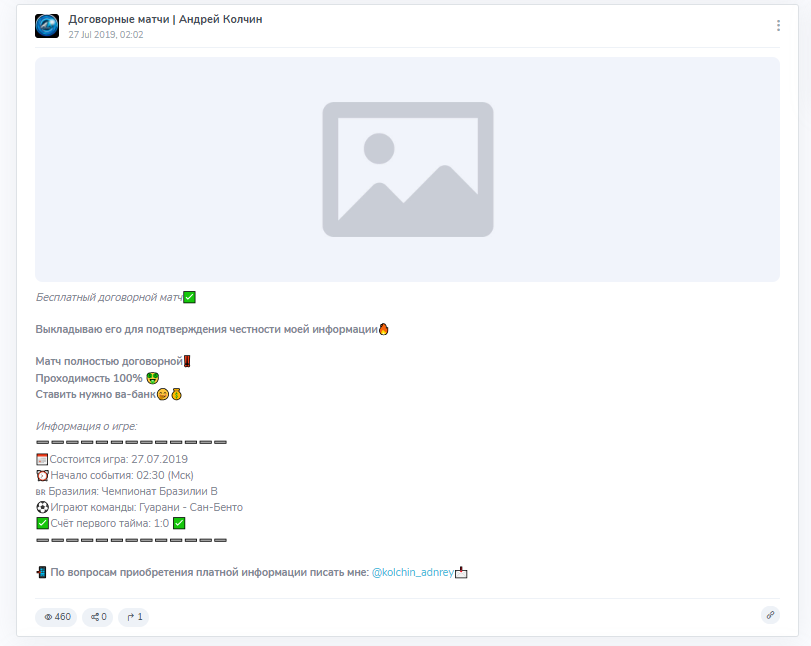 Однако надежных подтверждений словам капера не предоставлено. В постах автор указывал, когда пройдет встреча. После матча выкладывал пост с результатами. Отчетов в рамках верификатора не предоставлено.
