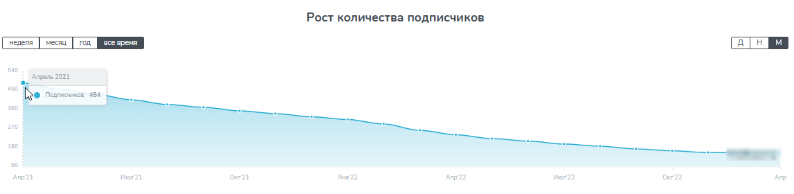 На графике видно, что у проекта никогда не было большого количества подписчиков. В 2021 году за ресурсом следило около 480 человек. Возможно, ранее канал пользовался большей популярностью. Данных за 2019 и 2020 год нет в открытом доступе. Накрутка маловероятна, если учитывать масштаб аудитории.