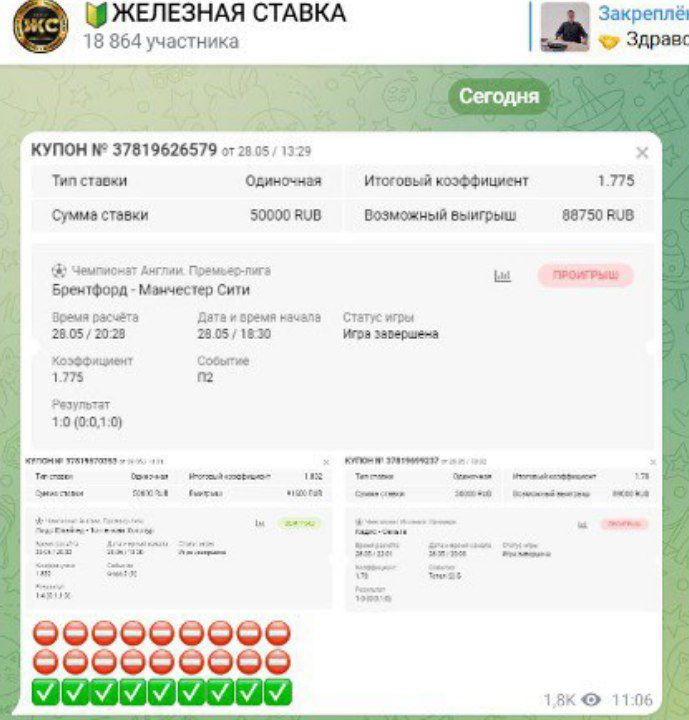 Контент в Telegram-канале Железная ставка включает одиночные ставки преимущественно на футбол и хоккей, с кэфами в диапазоне от 1.4 до 1.8. Экспрессы практически не публикуются. В отдельных случаях встречаются сообщения о договорных матчах, однако подробностей не приводится. Полноценной аналитики игр не предоставляется, посты ограничены краткими формулировками исходов.