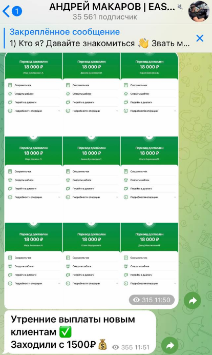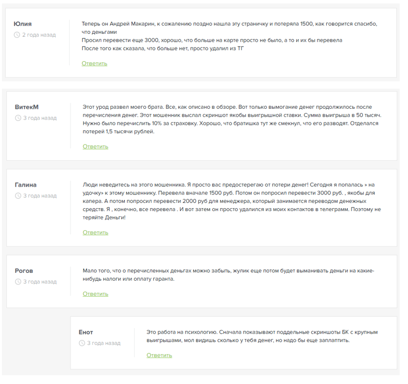 Комментарии на канале закрыты, положительных отзывов клиентов Андрей Макаров не публикует. На независимых сайтах ресурс признан мошенническим. Кроме разоблачений развода, есть жалобы обманутых игроков.