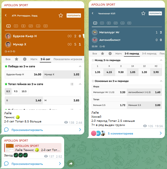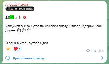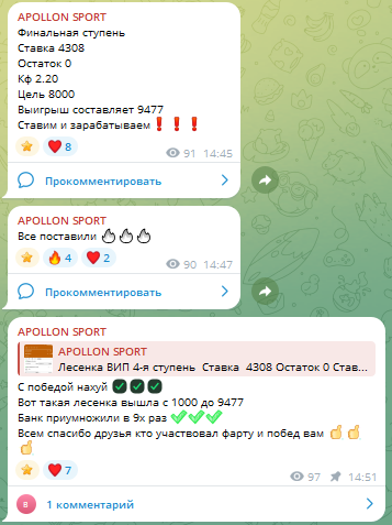 В паблике телеграм открыты комментарии и беттеры обсуждают уровень мастерства каппера, оставляют отзывы на APOLLON SPORT. Жалоб нет, но сильным прогнозистом автора не считают.