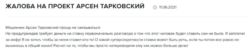 На сторонних сайтах мы встретили жалобы и негативные отзывы на Арсена Тарковского. Бывшие клиенты описывают схемы мошенничества как будто каппер Afootball не скидывал информацию, а просил скидывать средства ему для проставления в бк.