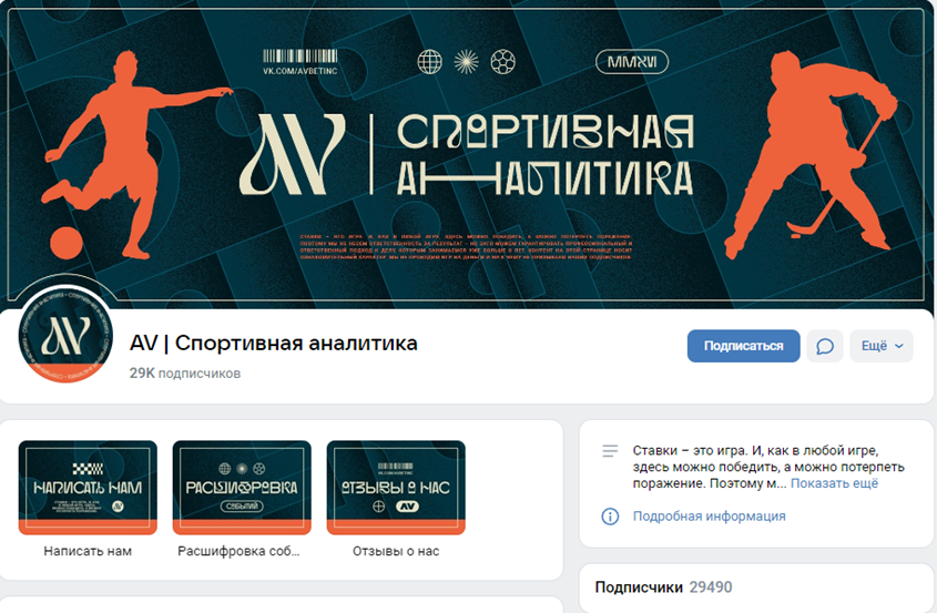 Телеграмм-канал и группа во вконтакте у ресурса на данный момент носят название «AV | Спортивная аналитика», хотя раньше такое название было только у паблика в вк, а телеграмм-канал можно было найти по запросу «AV|Прогнозы на спорт». В любом случае, рассматривать каждую страницу отдельно нет смысла, так как везде публикуются одни и те же посты.