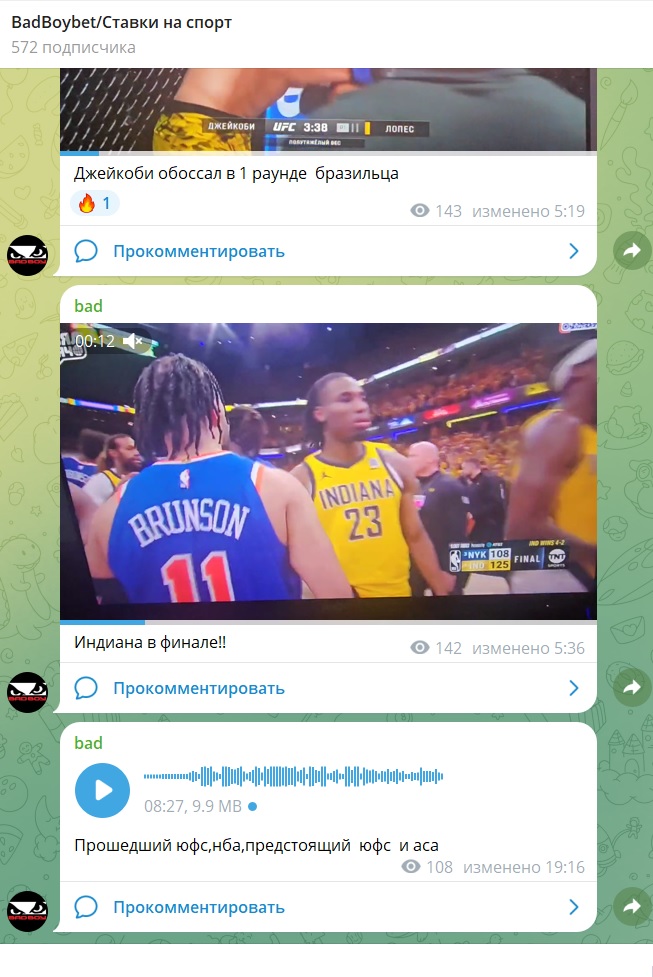 Badboybet — капперский проект, представленный в Телеграм и в ВК. Он предлагает ставки и прогнозы на спорт. Прогнозист рассматривает две дисциплины — MMA и баскетбол. Капер дает описания и трансляции соревнований, ставит 1-2% от банка, что считается разумным. Наша команда провела проверку этого спортивного блога, чтобы выявить плюсы и минусы. Далее раскрываем наше разоблачение.