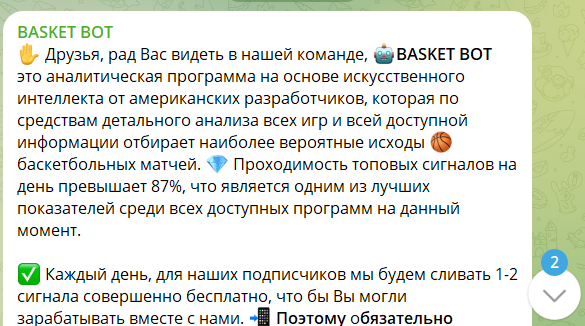 BASKET BOT — типичный телеграм-проект из серии «умный бот знает лучше». Каппер обещает почти космическую проходимость, ссылается на ИИ, алгоритмы и автоматический анализ, но на деле доверие к каналу держится на скринах и громких словах. Для опытного игрока здесь сразу загорается красная лампа: слишком много обещаний и слишком мало проверяемых фактов.