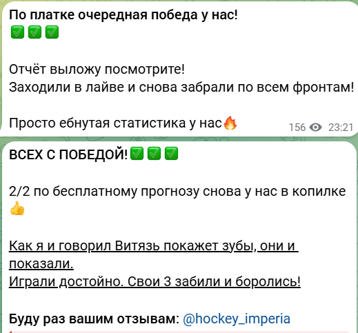 Hockey Imperia публикует отчеты в виде текстовых постов с поздравлениями с победой. Минусы удаляет из ленты, показывает только положительные результаты.