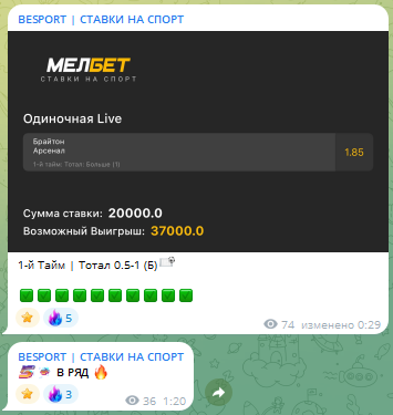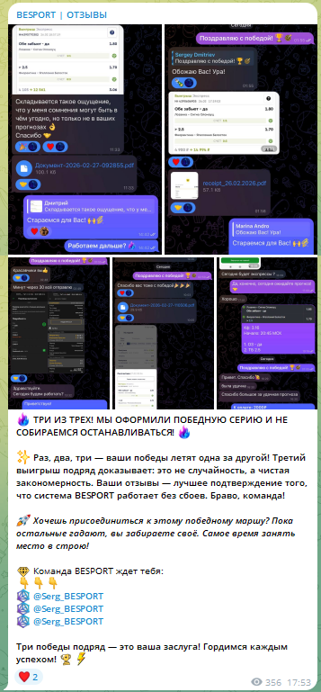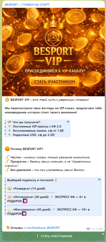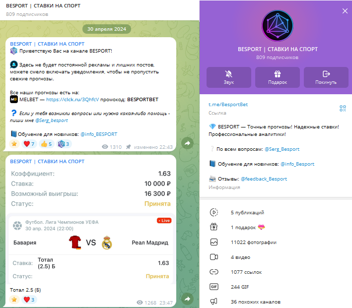Паблик в telegram BESPORT (около 800 подписчиков) создан в апреле 2024 года прогнозистом Сергеем. В первом посте сразу реклама букмекерской конторе — и это о многом говорит. При публикации прогнозов акцентированность на ней большая.