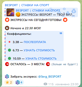 Сообщество BESPORT работает в телеграм почти два года и тематика его не меняется — ставки на спорт. Каппер Сергей Дмитриев ведет постоянное сотрудничество с букмекером, и хотя уже это не вызывает доверие, на разоблачение ресурса нас натолкнули его платные экспрессы. Судя по всему, это развод.