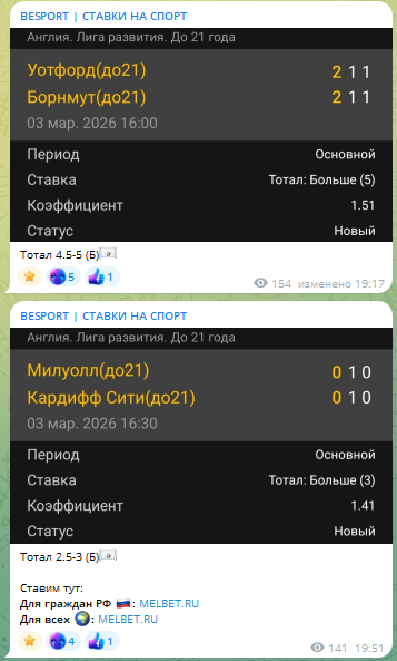 Отзывы на телеграмм-канал BESPORT: ставки от пользователя Serg Besport и их статистика