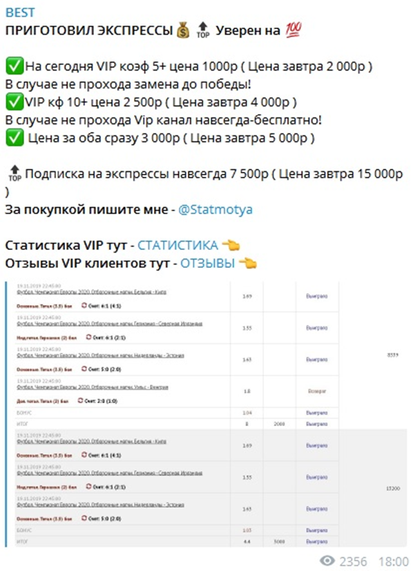 Наш сегодняшний герой в качестве бесплатных предиктов публикует посты со скриншотом матча и письменным указанием события. Автор никак не объясняет причины сделанного выбора и не обозревает прошедшие встречи. Коэффициенты оставляют желать лучшего. У большинства прогнозов котировки не превышают планку в 1.5. Владелец телеграмм-канала Best bet просто делает ставку на фаворита, чем могут заниматься даже неопытные беттеры. В рамках платной услуги подписчикам предлагают экспрессы с котировками 5-10 и выше.