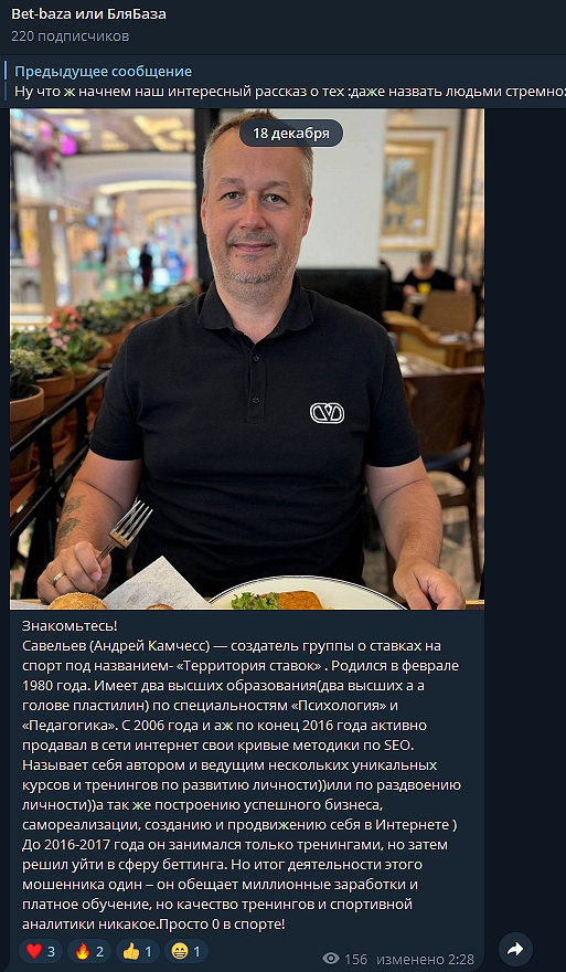 Андрей Савельев, он же «Камчесс», описан фолловерами чата @betbazza как экс-коуч по «финансовым практикам», то есть рядовой инфоцыган с претензией на экспертность. Примерно в 2019 тот «переобулся» в «топ-аналитика» и начал торговлю спортивными прогнозами с нулевой реальной проходимостью, сливая банк игроков и конечно же поднимая добавочный пассивный доход на «партнерках» БК.