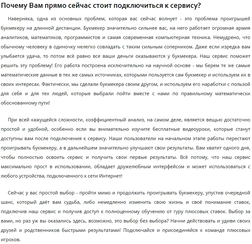 Что именно продают Гальцев и Савельев — с ходу не понять, и составить примерное представление о его «курсах» и «книгах» можно лишь на сторонних ресурсах. На одностраничнике Bet-Baza Ru выложено описание плюсов «сервиса аналитики» и прайс-лист на вип-доступ, но большей конкретики здесь не найти.