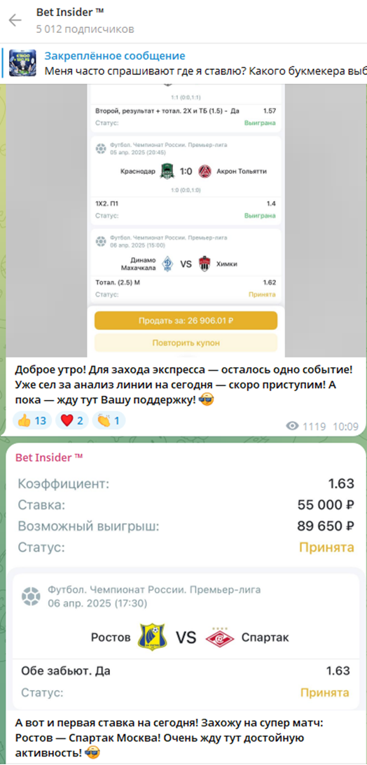Каждый день автор @by_Mir делится 1-2 ставками на футбольные или хоккейные матчи. Подробной аналитики от нашего героя ждать не стоит, в постах присутствуют только скрины купонов, а текст с разбором предстоящей встречи можно увидеть лишь в некоторых записях. У ординаров из телеграмм-канала Bet Insider котировки редко превышают планку 1.6. Это говорит о том, что основатель паблика привык выбирать событие с изначально большим шансом на заход. Такой подход свойственен для новичков и лудоманов, но никак не для опытных капперов. Экспрессы автор составляет из таких же событий, итоговый коэффициент по ним находится в промежутке от 4 до 10.