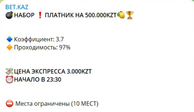 Чтобы получить платный экспресс, не нужно вступать в отдельный ВИП чат. Экспрессы продаются поштучно, цена – 3 тыс. тенге (500 рублей). Чтобы беттеры быстрее принимали решение, админ предупреждает, что количество мест на платную рассылку ограничено.