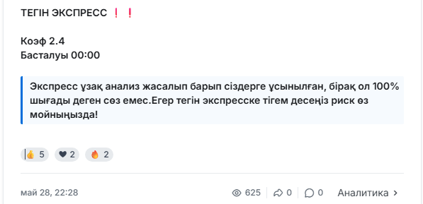 Капер публикует скрин купона БК и иногда дополняет пост сообщением о том, что сам поставил на данный исход несколько тысяч тенге. Результатов проведенного анализа матча, статистики, формы, трендов команд и прочего не размещают. Прогноз не подкреплен аналитикой, из-за чего указанные исходы не имеют аргументации.