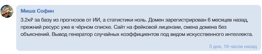 Отдельная проблема — сотрудничество с букмекерскими конторами. В прогнозах встречаются линии, которых нет у легальных БК, что намекает на работу с нелегалами. Это несет прямые риски для подписчиков, ведь в случае споров контора может не выплатить прибыль. Более того, проект периодически публикует прогнозы на матчи, которые уже завершились — очевидный фейк и прямое мошенничество.