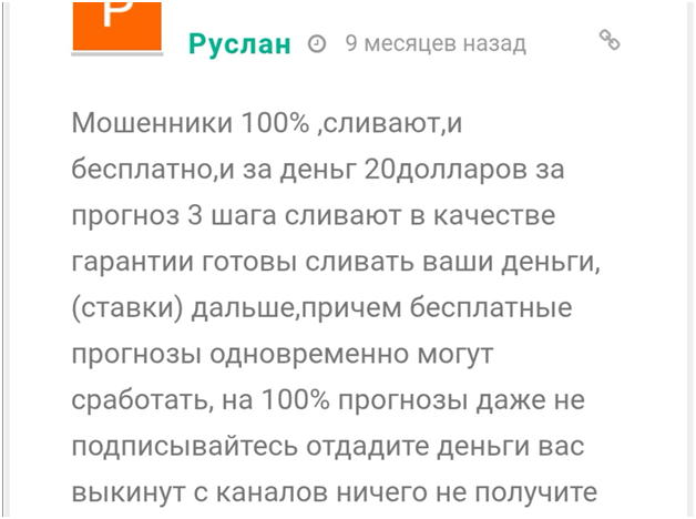 В своем сообществе Anita не публиковала отзывов от довольных клиентов. Зато очень много их есть в интернете. Пользователи недовольны сотрудничеством и обвиняют данного спортивного аналитика в мошенничестве. Например, Руслан рассказывает, что купил ставки на три шага за 20 долларов. Но прогнозы не прошли, поэтому ему не удалось ничего заработать. Причем таких историй в сети очень много.
