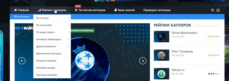 На сайте публикуется общий рейтинг капперов. Он зависит от вида спорта, наличия платных услуг, а также от активности специалистов в социальных сетях.