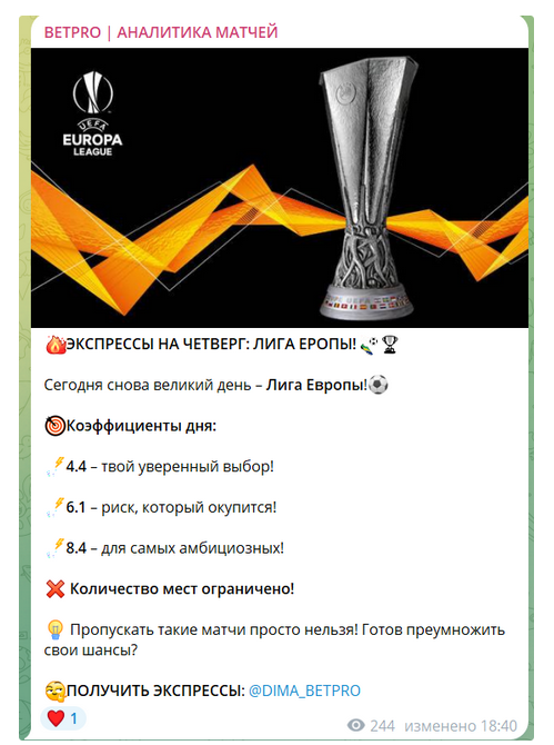 Об условиях сотрудничества в ленте нет никакой информации. Узнать о работе, а также об актуальных услугах можно у прогнозиста в личке – @dima_betpro.