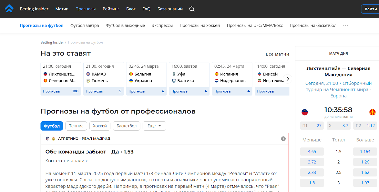 Betting Insider – проект для любителей ставок на спорт, где можно узнавать об актуальных матчах, спортивных новостях, самостоятельно заключать пари по советам экспертов, следить за статистикой.