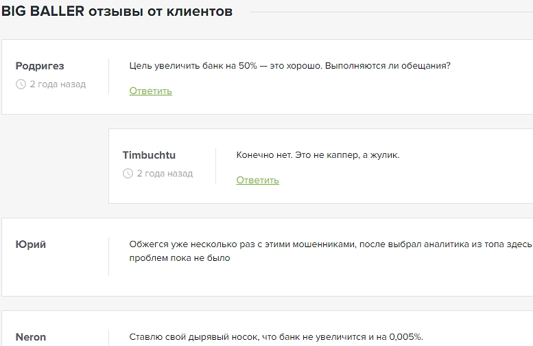 Это доказывают поддельные отзывы о BIG BALLER, где неустановленные лица «отчитываются» о заработке. На всё про всё хватило трех минут, зато на независимых форумах нет свидетельств о положительном эффекте сотрудничества с админом.