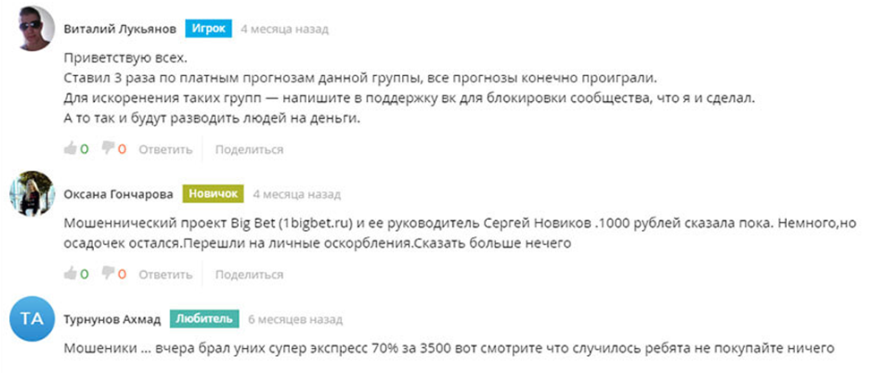 В это же время в паблике во вконтакте юзерам предлагают повторить бесплатные ставки от автора. На группу во вконтакте подписаны несколько сотен тысяч человек. Наличие такой большой аудитории объясняется популярность прогнозиста среди начинающих беттеров. Основатель ресурса запретил подписчикам писать комментарии, что выглядит очень странно. Он также решил не контактировать с участниками проекта Big Bet, у сообщества нет отдельного чата или тем для обсуждения внутри паблика. Помимо бесплатных ставок, в ленте можно увидеть многочисленные отзывы в формате сообщений и даже видео. Конкретнее тему отзывов мы разберем немного позже.