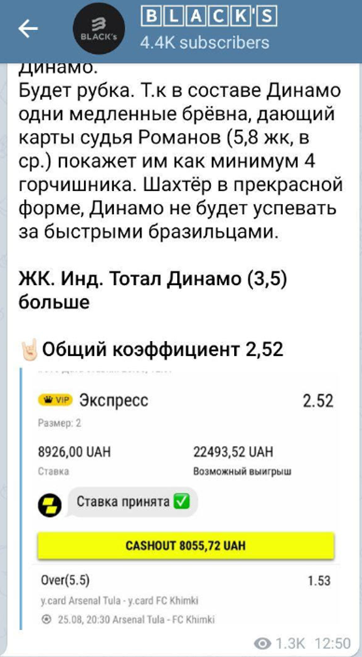 В описании паблика отсутствует дополнительная информация о направленности проекта. Нет в шапке профиля и упоминаний об опыте автора в прогнозировании футбольных и хоккейных матчей. Наш сегодняшний герой решил не распыляться сразу на несколько дисциплин и выбрал два основных направления. Настоящее имя аналитика узнать не удалось. Для связи с беттерами автор использует аккаунт @blackssup.