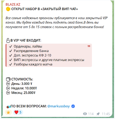 Телеграмм-канал BLAZE KZ: отзывы, надежность ставок на матчи в БК и чем занимается беттер Markussboy