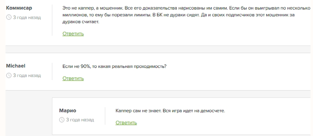 Пишут, что в Телеграм вся статистика нарисована, ставки проставлены с виртуального счета. Каппер сам не знает проходимость, поэтому покупать его прогнозы и заключать пари рискованно. Получить заработок на случайных советах анонима точно не получится.
