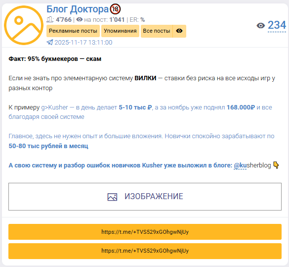 Блог Доктора в telegram посвящен преимущественно мужском здоровью, советам и рецептам. В ленте можно встретить сообщения о капперах и букмекерских конторах, но сам автор не позиционирует себя как надежного прогнозиста. Предполагаем, что это реклама, но анализ ресурса на наличие мошенничества все равно необходим.