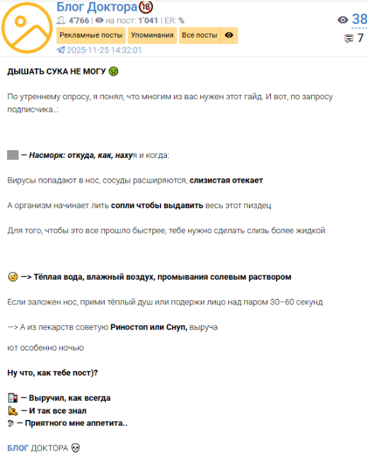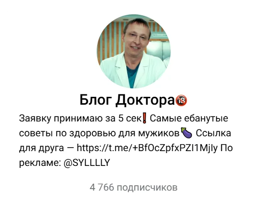 Телеграм-канал Блог Доктора создан в октябре 2025 года, его аудитория перевалила за 4500 подписчиков. Имя автора неизвестно.