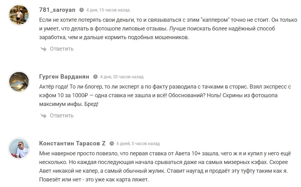 Одна из схем развода — экспрессы с космическими коэффициентами от 10+. Беттеры знают, что ставки на такие прессы приведут к сливу банка. Капер играет на доверии и продает «паровозы» от 2 500 рублей. Есть вип-чат, где позиционируется якобы премиум-контент с отчетами только с плюсами, скринами положительных результатов. Но их легко подделать. Статистика сомнительна, доход большинства пользователей на дистанции близок к нулю.