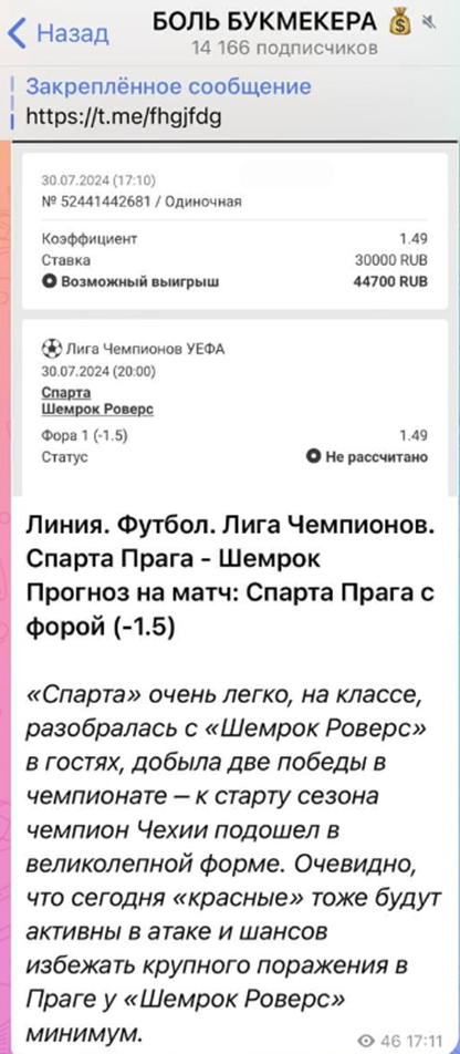 Суть единственной платной услуги в проекте сводится к предоставлению инсайдерской информации от автора для якобы гарантированного заработка на ставках. При этом пользователю не предлагают заплатить определенную сумму для получения пари. Юзер должен перечислить деньги капперу @aleksandrt2024 для ставки, а после захода прогноза аналитик заберет себе 40 процентов прибыли за посредничество. Необходимость в переводе суммы для ставки аналитику заключается якобы в недопущении распространения информации.