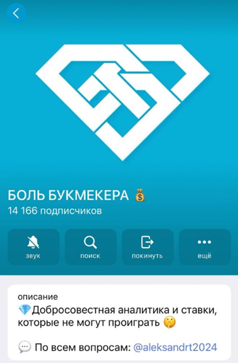 К слову, автор о себе ничего не рассказывает. В группе нет данных о реальном имени и личности каппера. Он не стал делиться ссылками на свои социальные сети, а внутри мессенджера для связи с аудиторией используется профиль @aleksandrt2024.