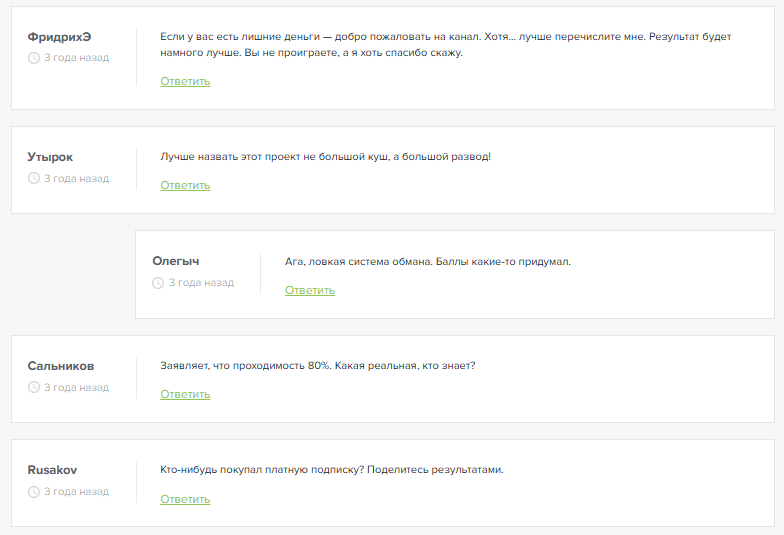 Мы изучили репутацию телеграм-канала Большой Куш на других ресурсах и нашли много негативных отзывов от реальных игроков. Пользователи оставляют жалобы на отсутствие результатов. По их словам, платные экспрессы вообще не заходят. Люди называют проект разводом и схемой мошенничества.